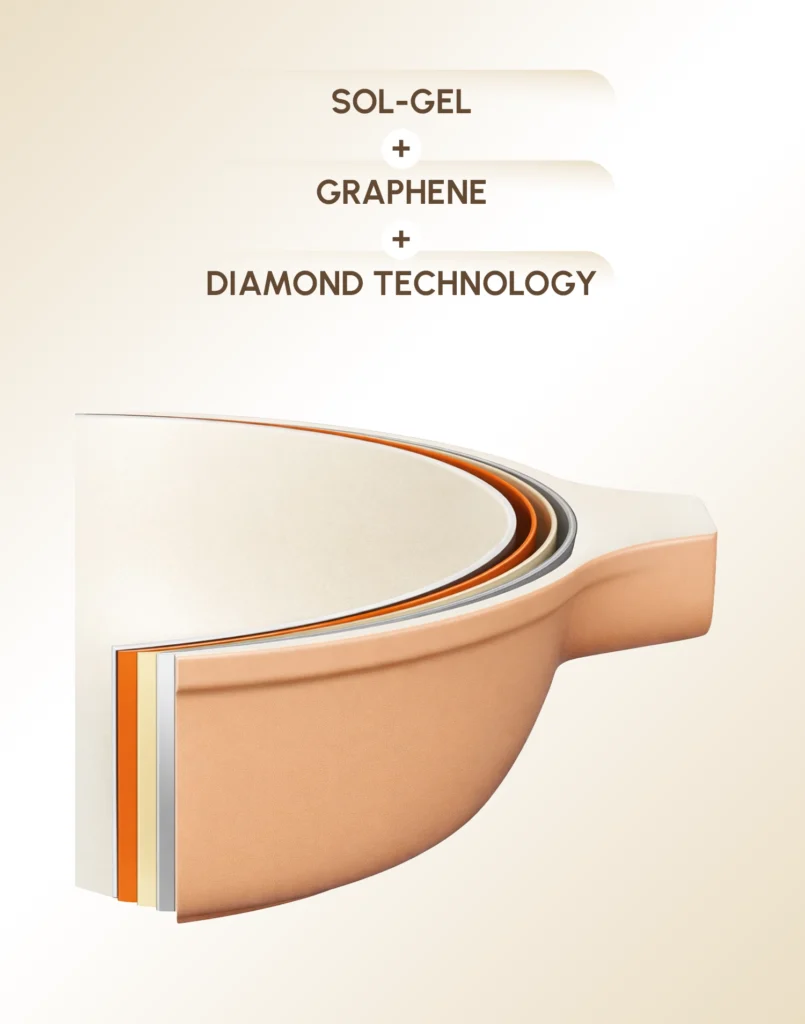 นวัตกรรมเซรามิกจากแร่ธรรมชาติที่พัฒนาโดยผู้เชี่ยวชาญด้านเซรามิกซึ่งเพิ่มประสิทธิภาพของเซรามิกให้มีความลื่นขึ้นลดการเกาะตัวของผลึกของเหลว เสมือนผิวของใบบัว โครงสร้างแข็งแรงที่สุด ใช้กับความร้อนได้สูงสุด “ปลอดภัยจากสารเคมีหรือสารก่อมะเร็ง” อย่าง PFOA&PFAS และทำอาหารได้แบบใช้น้ำมันน้อยโดยที่ไม่ติดกระทะได้ เพราะ นี่คือเทคโนโลยีผิวเคลือบกระทะเซรามิกที่ใหม่ที่สุดและดีที่สุดของ Excilon (ECL) การันตีมาตรฐานและเป็นที่ยอมรับอย่างแพร่หลายทั่วโลก